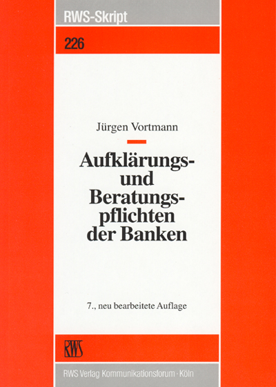 Inkassobank WuB I G 1.- 1.00 Anleger- und anlagegerechte Beratung beim Erwerb von DM-Auslandsanleihen (Fokker) WuB I G 5. - 9.00 Aufklärungspflichten der Bank bei Immobilienanlagen, Anwendbarkeit des VerbrKrG auf Kreditvollmachten WuB I G 1. –4.01 Mitverschulden eines Anlegers bei Versprechen einer auffällig hohen Rendite WuB I G 5. – 1.02 Aufklärungspflicht der Bank bei Immobilienkapitalanlagen, keine verbindliche Äußerung über den Wert der Immobilie durch Finanzierung WuB VIII D. Art. 1 Testamentsvollstreckung durch Banken und Steuerberater WuB I G 1.-1.03 Keine Haftung des nicht börsentermingeschäftsfähigen Mitinhabers eines oder Kontos WuB I G 1. – 2.03 Neuberechnung eines Oder-Kontos, über das Börsentermingeschäfte eines der beiden Kontoinhaber abgewickelt wurden WuB I G 1. – 4.03 Maßstab anlegergerechtern Beratung; Mitverschulden des Anlegers WuB I G 1. – 1.07 Haftung eines Anlagevermittlers, der Anlage als sicher bezeichnet, obwohl diese nach der Zuordnung der Anlagegesellschaft dem Risikoprofil "gewinnorientiert" und "risikobewusst" unterfällt Rezensionen Wagner, Insolvenzrecht, JA 1987, 112 Scholz/Lwowski, Kreditsicherungsrecht, JA 1987, 111 Walker/Brox, Zwangsvollstreckungsrecht, JA 1987, 56 Locher/Mes, Becksches Prozeßformularbuch, 2. Aufl., JA 1987, 252 Bülow, Recht der Kreditsicherheiten, 2. Aufl., KaRS 1989, 198 Klauss/Ose, Verbraucherkreditgeschäfte, KaRS 1989, 330 Wurm/Wagner/Zartmann, Das Rechtsformularbuch, 12. Aufl., KaRS 1990, 42 Haegele/Schöner/Stöber, Grundbuchrecht, 9. Aufl., KaRS 1990, 122 Ulmer/Brandner/Hensen, Kommentar zum AGB, 6. Aufl., KaRS 1990, 211 Albrecht, Zur Haftung von Banken gegenüber Nichtkunden im Zahlungsverkehr, WM 1990, 127 Reifner, Handbuch des Kreditrechts, ZBB 1992, 166 Krimphove, Anlageberatung, WM 1993, 359 Jost, Auskunfts- und Beratungshaftung, WM 1993, 359 v. Heymann, Bankenhaftung bei Immobilienanlagen, Bankinformation, Heft 8/93, 80 Wurm/Wagner/Zartmann, Das Rechtsformularbuch, 13. Aufl., WM 1994, 1268 Bruske, Beweiswürdigung und Beweislast für Aufklärungspflichtverletzung im Bankrecht, WM 1994, 1956 Hopt, Vertrags- und Formularbuch zum Handels-, Gesellschafts, Bank- und Transportrecht, WM 1996, 891 Schimansky/Bunte/Lwowski, Bankrechts-Handbuch, NJW 1998, 290 Bülow,Verbraucherkreditgesetz, 3. Aufl., NJW 1999, 123 Fischer/Klanten, Bankrecht, WM 2001, 330 Schiereck, Nachfolgefragen, BKR 2004, 237